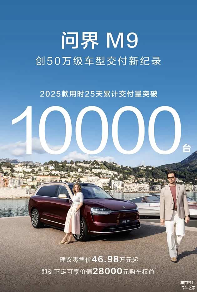 作为全景智慧旗舰SUV,问界M9 2025款的销量表现尤为亮眼。自3月20日上市以来,问界M9 2025款25天内累计交付超过了1万台,创造了50万级以上车型的交付纪录;问界M9自开启大规模交付以来,已累计交付突破18万台,连续11个月蝉联50万级以上豪华车月度销冠。