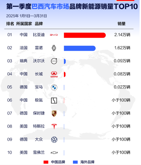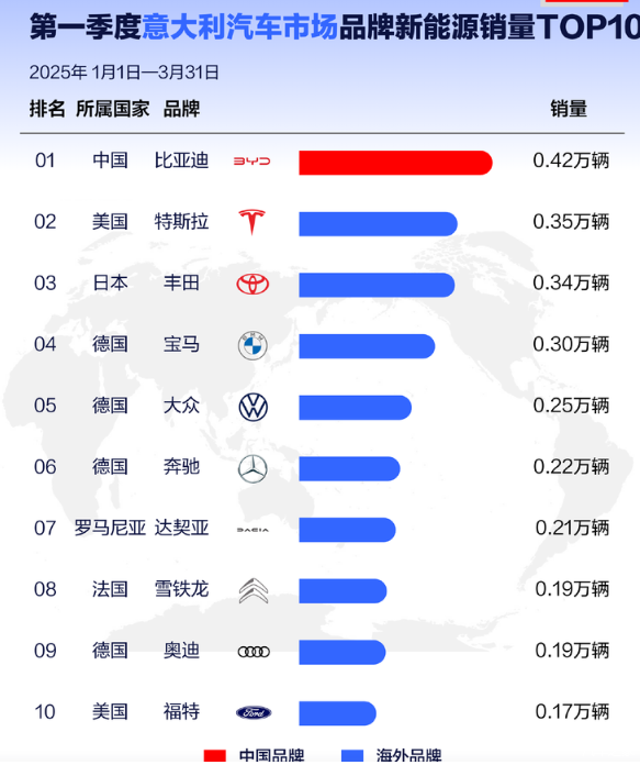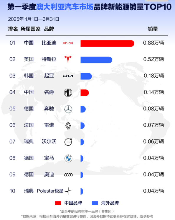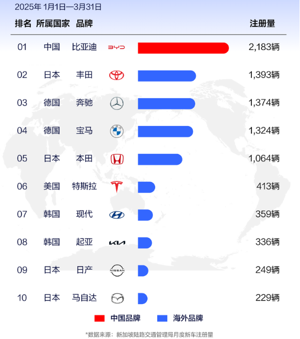 2025年一季度,比亚迪以强劲势头在全球新能源汽车市场实现“霸榜”,于中国香港、新加坡、巴西、意大利、泰国、澳大利亚及英国等多地荣膺销冠,彰显其全球化战略的卓越成效。