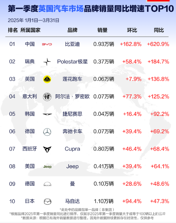 英国市场一季度销量同比激增620%,宋Plus DM-i成为最畅销插混车型,凸显比亚迪技术产品的竞争力。