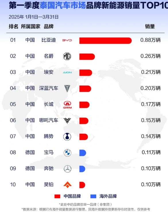 泰国市场,比亚迪凭借本土化生产优势,一季度新能源销量达0.88万辆,并在国际车展中以超1万辆订单打破日系品牌垄断,推动中国品牌在东南亚认可度跃升。