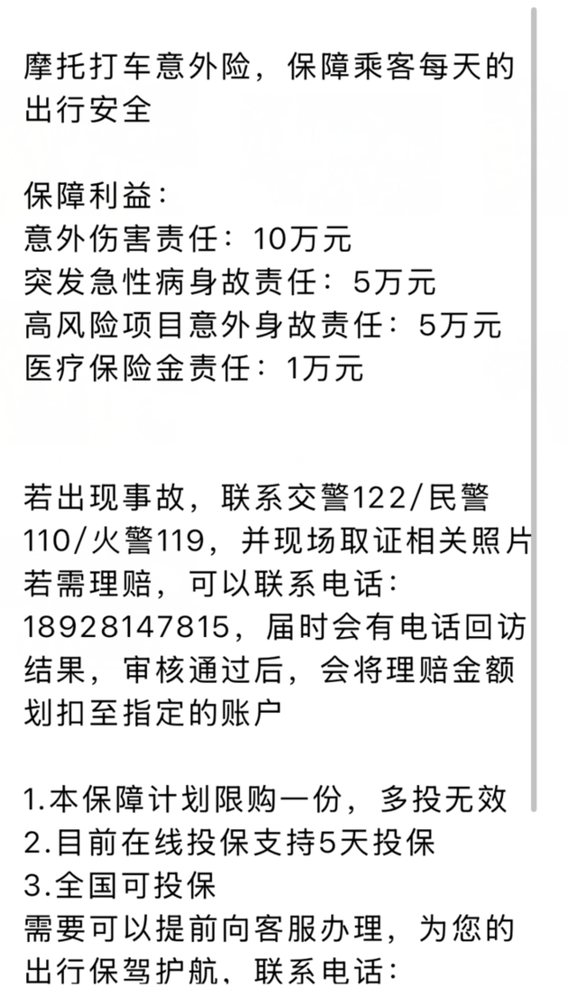 同时也给营运摩托车提供了乘客意外险的保障,标准如下。