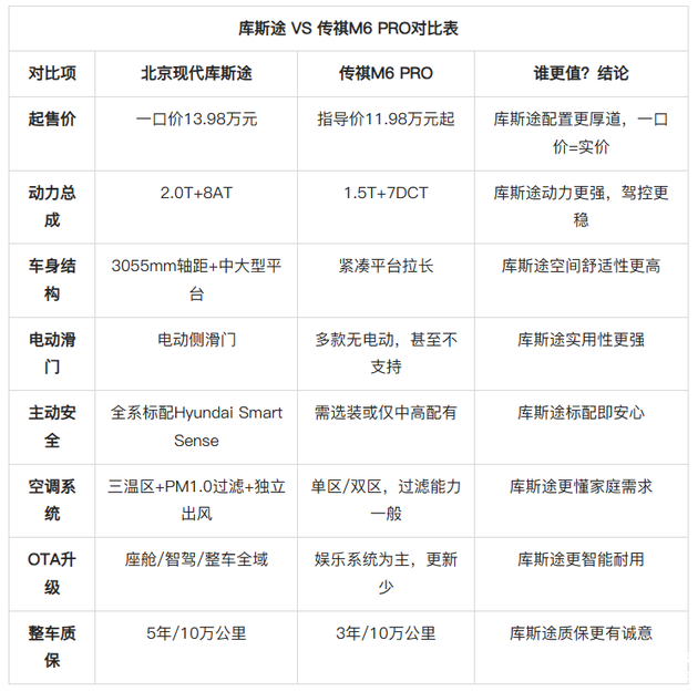 最后,我觉得用一张现代库斯途和传祺M6 PRO的对比表来具像两款车型,这样比较明了: