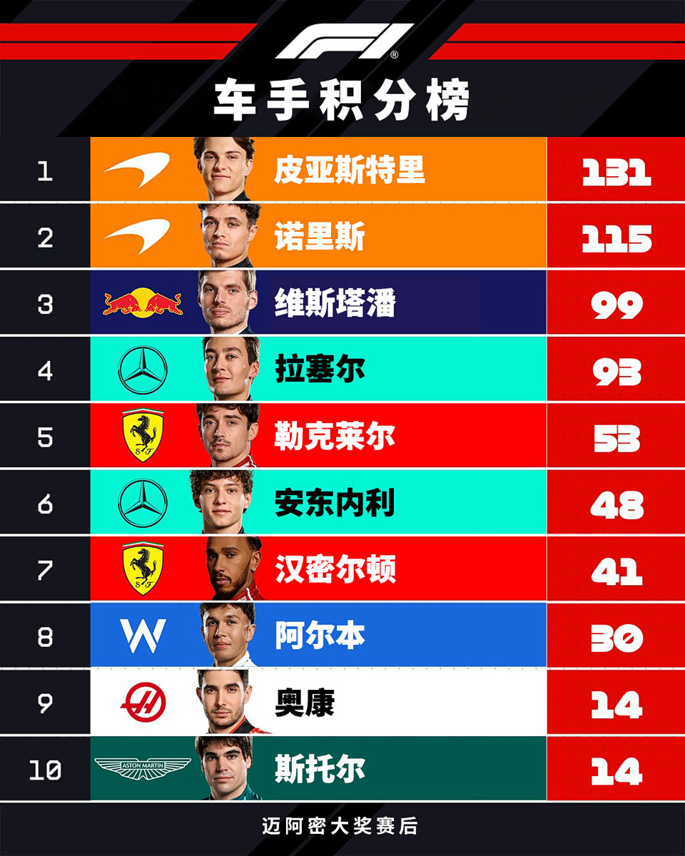 如果维斯塔潘在夏秋期之前,没能在车手积分榜上排名前二,那大概率他就可以启动“车手跳出条款”。(这是外媒的小道消息) 现在潘子和红牛的合同是到2028年,不过按照霍纳的公开表态:“我们还没有办法和迈凯伦竞争”,这也就预示着维斯塔潘恢复自由身的可能性。 其实在现在每场比赛的Team Radio里,几乎都能听到潘子的抱怨,对于这样的冠军车手来说,细微的不足,都能成为影响他夺冠的绊脚石。 反观红牛的二号车手,当年的佩雷兹绝对是最出色的僚机,可能是对角田有一定的宽容度,我觉得他还需要几场比赛的时间,以及更好的运气,从而帮助潘子、帮助车队……