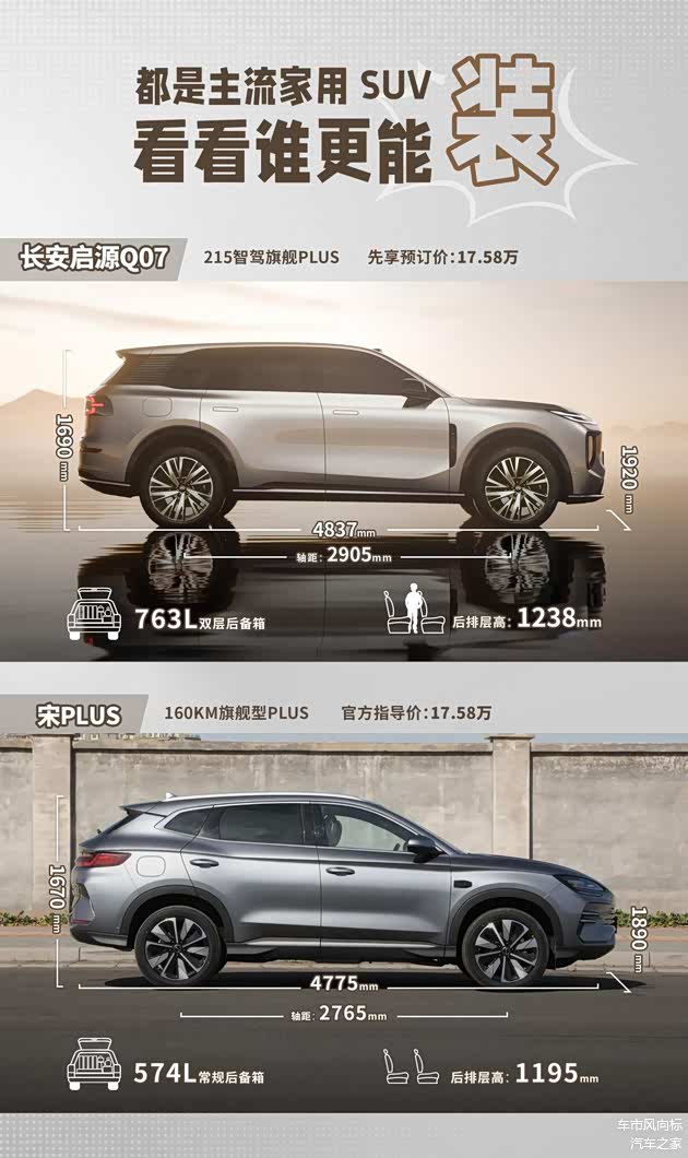 再就是后备厢,长安启源Q07基础容积做到了763L,最大可拓展出1759L容量;宋PLUS DM-i后备厢基础容积为574L,最大可拓展出1440L。对比来看,作为中型SUV的长安启源Q07,也占据了载物优势。