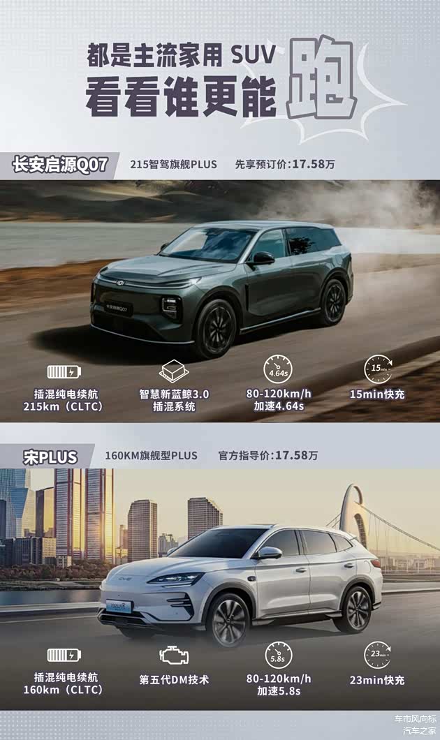 行驶系统来看,长安启源Q07和宋PLUS DM-i均采用插电混合动力,长安启源Q07提供1.5L、1.5T两套插混动力可选,0-100km/h加速时间最快为7.36s;宋PLUS DM-i提供的是1.5L插混系统,0-100km/h加速时间为7.7s,对比之下,两车性能差异并不大。但从更考验高速动力的80km/h-120km/h加速来看,长安启源Q07只需要4.64s,宋PLUS DM-i则需要5.8s。看来,带T动力的启源Q07,中后段加速响应还是更强一些。
