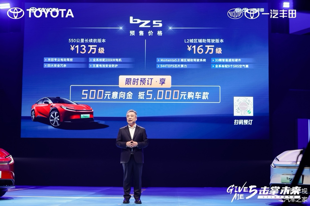 再讲讲在车展前一天发布的bZ5,这款车可太有料了。2024年,一汽丰田发布了IT'S TiME 2.0智能电混双擎技术品牌,三阶混动技术能给大家提供全域出行的最优解。bZ5就是基于这个技术打造的全新纯电车型。它定位“超感时空舱”,有全角度颜值、全守护安全、全沉浸智舱、全场景智能驾驶辅助、全保障QDR这五维核心价值,很多参加发布会的媒体记者都说,bZ5是当前安全智能辅助的标杆车型。