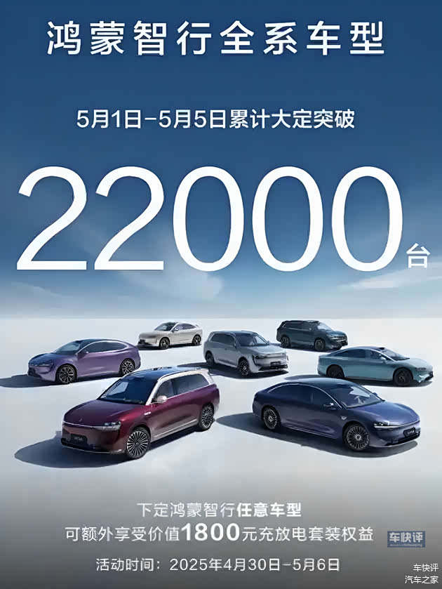 最新消息5月1日到5月5日五一长假期间,鸿蒙智行全系车型累计大定突破22000辆。平均下来,每天订单量就达到了4400辆。