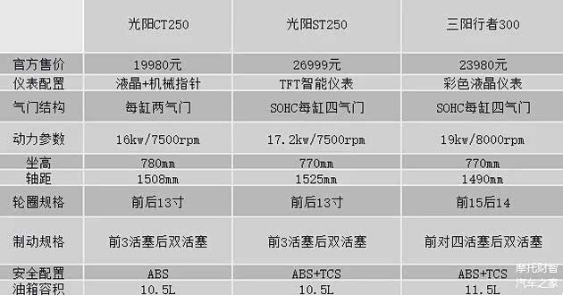 竞争分析市场上可供选择的250以上主流平踏板,仅有光阳的CT250(CT300已经停售了),ST250以及三阳的行者300可选,三车之间具体差异咱们一图看清楚。