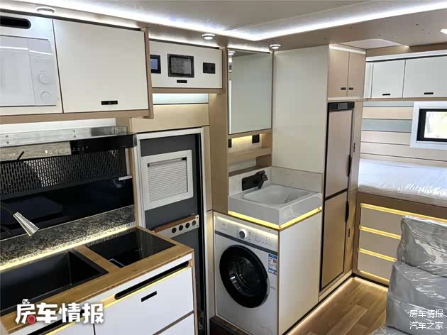 中门后方的设计也别具一格,采用了开放式洗手池 + 洗衣机 + 冰箱的组合区域,在同类房车中较为罕见,极大地提升了生活的便利性,让车主在旅途中也能享受到便捷的生活体验。