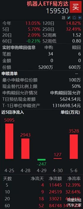 机器人ETF易方达(159530)跟踪国证机器人产业指数。数据显示,机器人ETF易方达(159530)持续获资金青睐,昨日资金净流入超3500万,近10日资金净流入超2.4亿,近60日资金净流入超8.4亿;该基金最新规模近11亿,同类第一。截至发稿,该基金5月7日盘中获净申购4600万份。