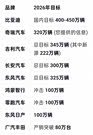 2026年汽车企业目标 1月份是适合立flag的,让deepseek汇总了一下各品牌2026年目标。 比亚迪国内目标400—450万辆,2025年460万辆,其中海外市场105万辆,也即国内市场355万辆。从增长幅度看,2026年的目标还不是很“激进”。 奇瑞,吉利,长安,东风,目标都迈进了300万辆的门槛。 鸿蒙智行100万辆,这个是比较恐怖的,豪华车市场肯定是要变天了。 零跑汽车100万辆,增长幅度是比较大的。