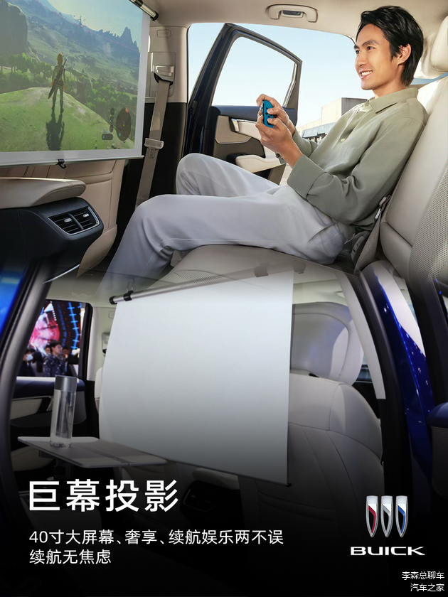 第三个巨幕投影,一般是豪华大空间车型才有的,而且选装价格偏高,例如问界m9,原⼚选装需要20000元 。但是别克君越后排空间很宽敞,还有图书馆级的静音,和四大天王座椅,加装上40英⼨超⼤屏幕,秒变舒适奢享私密空间,看电影、娱乐、办公都没问题。豪华感瞬间提升。