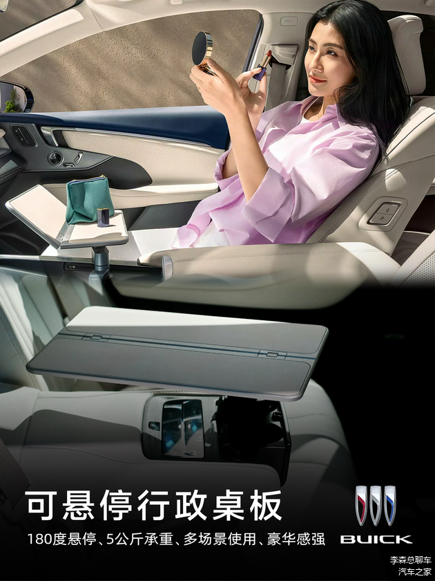 第二个可悬停⾏政桌板,这个配置可是迈巴赫四座版才有的功能。现在二十万级别的别克君越直接让你体验到百万车型的感受。不仅提升豪华感,而且 5公斤的承重,在车上办公、吃饭、化妆都没压力且非常方便。360度⽆桌腿悬浮形式,防滑桌板180度任意⻆度悬停,配合宽敞的前后排空间,也更⾃在◦ 关键是原⻋尺⼨设计收纳,桌板可对折,收纳于前排中央扶⼿箱还节省空间。
