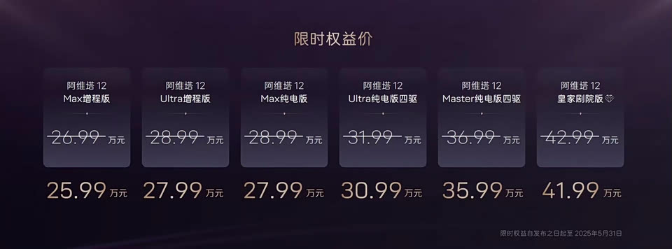 新款阿维塔12上市,售价26.99万元-42.99万元,5月31日前可享限时权益价25.99万元-41.99万元。 纯电后驱车型最大功率237kW,峰值扭矩396N·m,CLTC续航里程755km;纯电四驱车型综合最大功率402kW,峰值扭矩687N·m,CLTC续航里程705km。 增程车型搭载1.5T增程系统,最大功率231kW,峰值扭矩367牛·米,CLTC纯电续航245km,综合续航1155km。