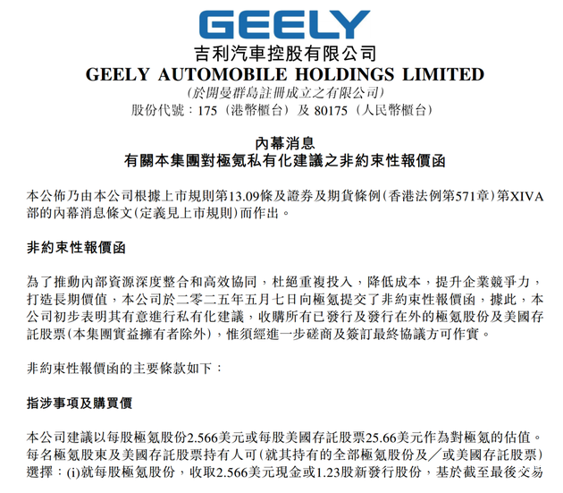 2025年5月7日,中国汽车行业迎来一则重磅消息——吉利汽车宣布向旗下高端电动车品牌极氪提交非约束性私有化要约,计划以每股美国存托股票(ADS)25.66美元的价格收购其尚未持有的34.3%股份,较前一交易日收盘价溢价13.6%。这一举措标志着吉利控股集团“回归一个吉利”战略进入实质性阶段,也预示着中国新能源汽车产业格局可能面临新一轮调整。