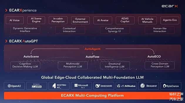 ECARX AutoGPT集成多模态感知、模糊意图理解能力,可联动车辆API执行跨应用任务,并兼容MCP协议接入第三方生态。该技术为行业首例十亿级参数车载大模型落地,奠定"AI定义汽车"硬件基座。