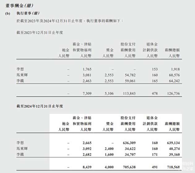 在这样的背景下,公司高管的薪酬也高得惊人,尤其是董事长兼CEO李想。据年报数据披露,2024年李想的薪酬总额为6.39亿元,乍一看还挺高的,但仔细观看其薪酬结构会发现,李想的薪酬由三部分组成,包括工资津贴266.5万元、退休金16万元以及高达6.36亿元的股份支付薪酬。