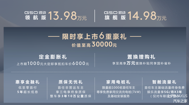 G50混动领航版售价13.98元,旗舰版14.98万元。新车上市之际,惊喜连连!即日起,用户下订即可享六大可叠加的上市权益,价值至高3万元!价格一步到位,权益一步到位,幸福触手可及!