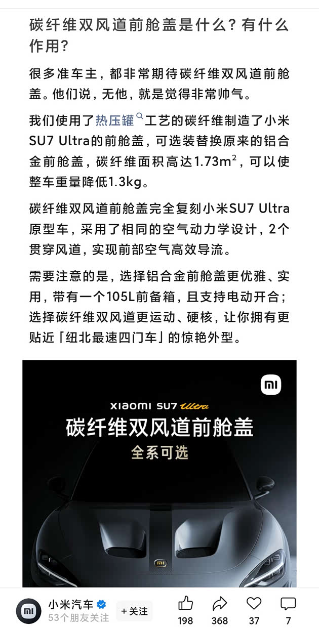此前雷军还曾在微博上表示“碳纤维前舱盖,不仅改了外观件,内部结构也改了,双风道直接导向轮毂,支持轮毂散热”。不过从目前多名博主的实测来看,小米SU7Ultra上选装价格高达4.2万的碳纤维双风道前舱盖并没有100%实现此前小米汽车和雷军所宣传的功能,这也是这个选装配置引发大量争议的关键所在。