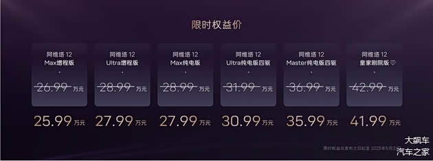 2025年5月7日,阿维塔科技正式发布2025款 阿维塔12车型,新车提供纯电与增程双动力版本,共6款配置,官方指导价26.99万至42.99万元。即日起至5月31日,购车用户可享至高5万元限时权益,实际到手价区间为25.99万至41.99万元。