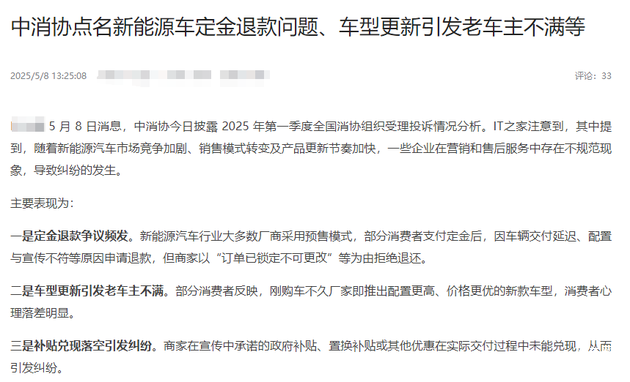 新能源汽车行业近年流行“预售模式”,消费者支付定金锁定权益,车企借此提前锁定订单、回笼资金。但这一模式在落地时却频频翻车。中消协数据显示,2025年一季度因定金退款引发的投诉同比激增33.33%。典型案例中,消费者孙先生购车后第二天,品牌就发布升级版车型,销售人员却未提前告知车型即将停产,导致其刚提车就过时。车企却以“订单锁定”为由拒绝退款,本质是将市场风险转嫁给消费者。