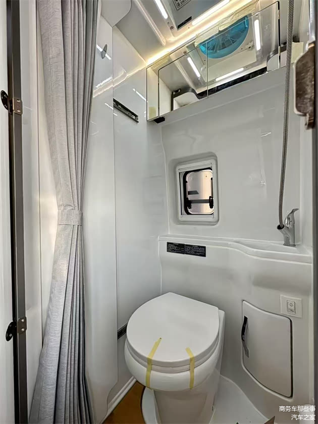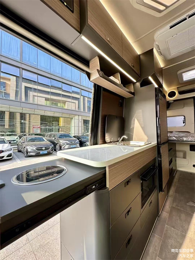 进入到车里面去标准的4座的一个布局,也是我们的一键启动,还有科技双联屏,倒车影像等等对我们的安全驾驶都有了各方面的保障。车内各个区域分工非常的明显,顶部是顶灯,靠顶部的位置做了一圈的吊柜,增大了车里面的储物空间,进门处是我们的厨房区域,带有我们的电磁炉翻盖板,洗水槽,还有我们的会客厅的取两个前后左右均可以移动的座椅前面是单独配备的小桌板,它是可以隐藏式也是可以拉起来的,不耽误车里面的用车空间。车子中间的部分是我们独立的卫生间的区域,这个卫生间的区域也非常的具有特色,因为它是可以带延伸的,需要使用的时候可以往外拉开,增加的使用面积,那平常则可以推进去增加了车外部的使用面积。
