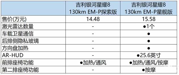 130km EM-i旗舰版售价14.18万,价格这次贵了1万。升级的配置有19英寸轮胎,电动后备箱,后排侧隐私玻璃,方向盘加热,25.6英寸AR-HUD,主驾座椅腰部支撑调节,副驾座椅高低调节,前排座椅按摩,前排座椅记忆,后排座椅按摩。这一配置主要提升的是舒适性,同时也是吉利银河星耀8与同级车型形成差异化的关键。