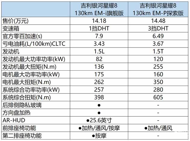 而动力方面,吉利银河星耀8也提供了多种方案既有注重能耗的雷神EM-i也有并重性能的EM-P。下面我们就来看看每一款配置之间的差异。