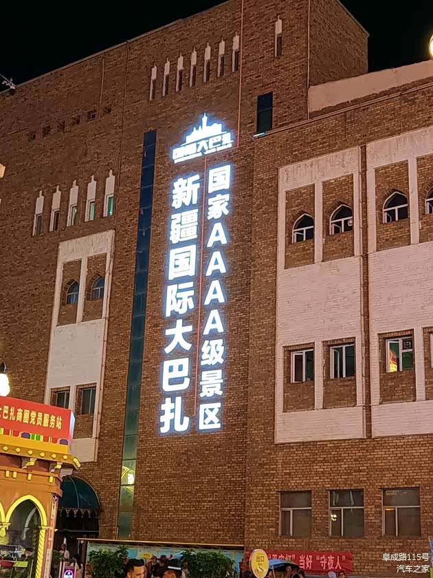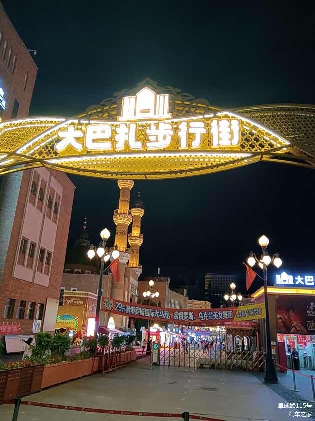 国际外贸大饭店虽然老了一点,可地理位置非常优越,过了马路就是新疆国际大巴扎的东南门。虽然下楼时已经是晚上9点,街上和国际大巴扎里人头攒动,一派热闹景象。新疆国际大巴扎位于乌鲁木齐市天山区解放南路510号,总面积达10万平方米,荟萃了3000余家商铺,是集特色建筑、民俗风情、风味美食、餐饮娱乐等为一体的景区,有“新疆之窗”“中亚之窗”的美誉。2003年8月新疆国际大巴扎正式开门迎客,]2011年新疆国际大巴扎被国家文化部评为“国家级文化产业示范基地”,2015年新疆国际大巴扎被评为国家AAAA级旅游景区。