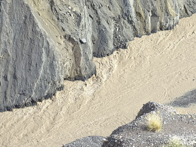 在《中国国家地理》2015年第5期的封面照上还是一条绿色与黄色相伴的河,今天看到的只是一条黄色的河流。在远处有一条碎石铺成的路沿着峭壁通向谷底,看着是危险重重。在谷底有一座古朴的大桥将路延伸到了峡谷对面的峡谷中。可以看到远处的峡谷中有拉矿石的大卡车在奔跑。