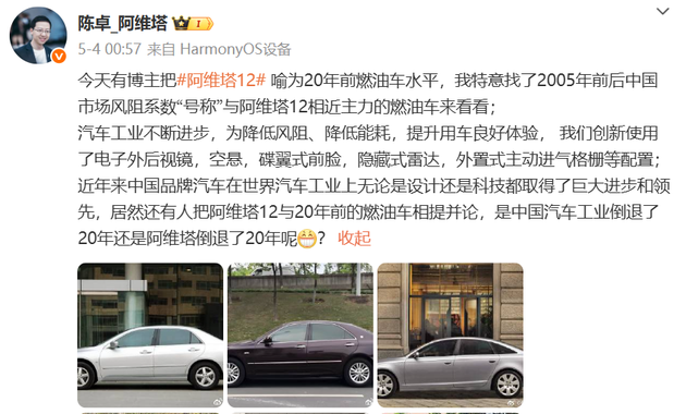 5月3日,某博主发文称“在实测中, 阿维塔12的风阻系数高达0.28Cd,与阿维塔宣传的0.21Cd严重不符”。在质疑之声发出之后,舆论开始哗然,大家纷纷开始质疑阿维塔12的风阻系数。