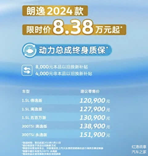 大众朗逸是一款热门的合资紧凑型轿车,目前从上汽大众官方获悉,即日起至5月31日,购买2024款 朗逸可享限时价8.38万元起(该价格适用于本品以旧换新方式),并可享动力总成终身质保、8000元本品以旧换新补贴、4000元非本品以旧换新补贴等权益。