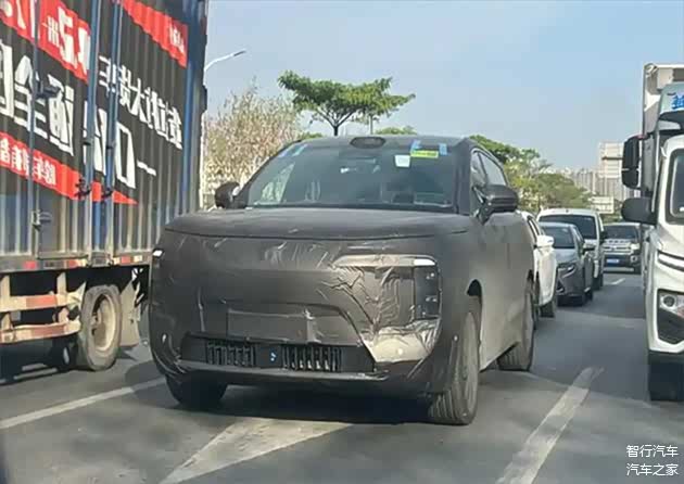 透过伪装可以看到,车头部分,新车采用了扁平的大灯,而雾灯区域则是采用了 C 字形的设计,这一点跟腾势 N9 还是比较相似的。车头采用了封闭式设计,格栅部分呈现出梯形造型。