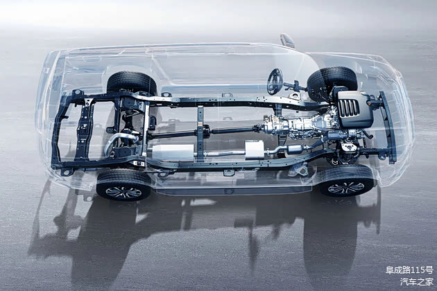 在巨大的身形内,采用的是来自于长城汽车的坦克平台,加强式大梁最大截面达到160X130mm,扭矩刚度为232kN·m/rad。车身采用笼式设计,且高强度钢材占比达到73.79%,并在关键部位采用抗拉强度超1500MPa钢材,在大幅提升安全性的同时可以为整车操控稳定性提供保障。前悬架结构采用双叉臂独立,后悬架采用五连杆整体桥式非独立设计,在满足舒适性的同时,也兼顾了承载性。