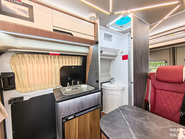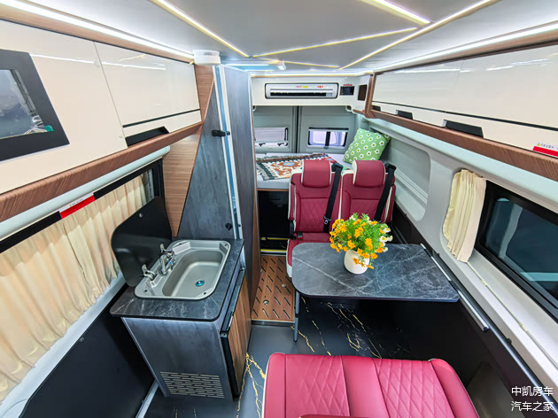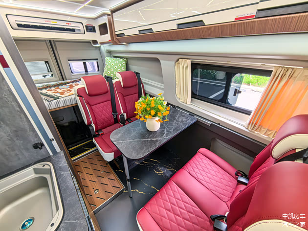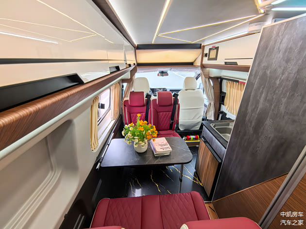 前2后4六座布局,最新的轻奢系内饰,ENF级别房车专用板材,中凯定制航空铝地板,樱桃红的皮质座椅,可调节更舒适,中间是可移动小桌板,可以放置在中门处。