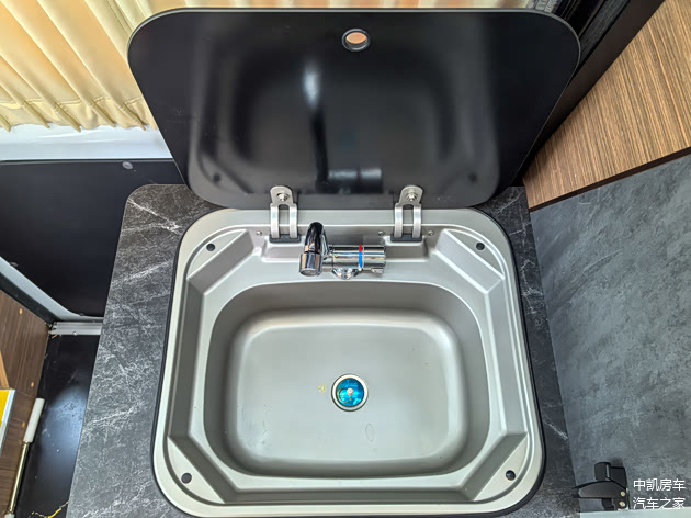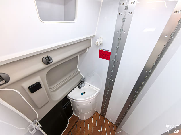 折叠门的洗浴间,使用时空间扩大50%,不用时方便前后穿梭,非常人性化的设计。里面是ABS航空吸塑开模件定制而成,上方有双向换气扇,还有抽拉淋浴花洒和洗手池,配有90L的清水箱,以及热水器,洗澡上厕所皆可。