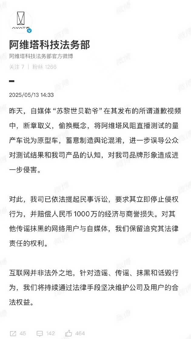 对于博主“苏黎世贝勒爷”的再次挑衅,阿维塔法务部近日发布微博表示:“昨天,自媒体“苏黎世贝勒爷”在其发布的所谓道歉视频中,断章取义,偷换概念,将阿维塔风阻直播测试的量产车说为原型车,蓄意制造舆论混淆,进一步误导公众对测试结果和我司产品的认知,对我司品牌形象造成进-步侵害。对此,我司已依法提起民事诉讼,要求其立即停止侵权行为,并赔偿人民币1000万的经济与商誉损失。对其他传谣抹黑的网络用户与自媒体,我们保留追究其法律责任的权利。”