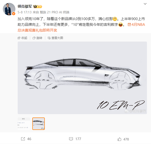 最近,领克汽车高层的一则动态在车圈掀起波澜——穆军在微博晒出一组手稿图,并配文“下半年还有更多,10肯定是我今年的吉利数字”。眼尖的网友立刻发现,图中车型轮廓与年初漠河冰雪测试的伪装车高度吻合,结合内部代号P371的传闻, 领克Z10混动版即将面世的传闻越来越多。