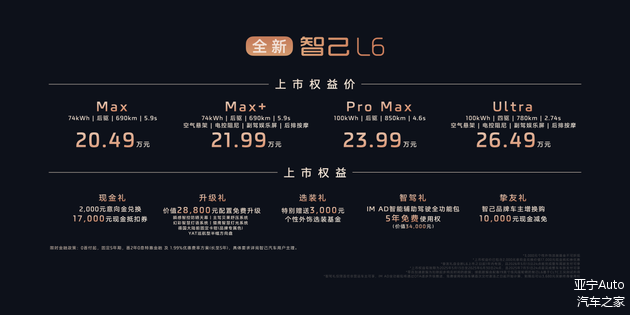全新智己L6此次共推出四大配置版本,官方指导价为21.99万元至27.99万元。限时上市权益价格分别为:Max版20.49万元,Max+版21.99万元,Pro Max版23.99万元,Ultra版26.49万元。