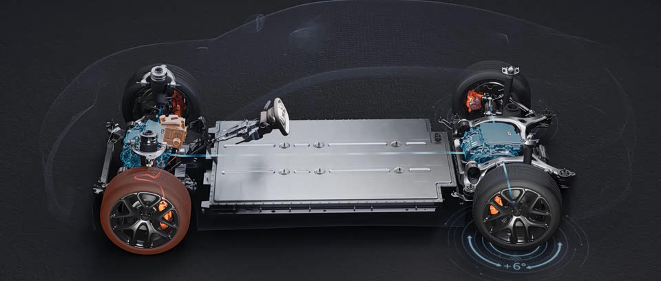 灵蜥数字底盘2.0,支持四轮转向、爆胎稳定控制、蟹行模式、ICS舒适制动。前双叉臂、后多连杆悬架,Max+和Ultra配空气悬架、电控动态阻尼调节系统。19寸轻量化轮圈,配前后245毫米宽度韩泰iON高性能新能源轮胎、大陆前四活塞刹车。