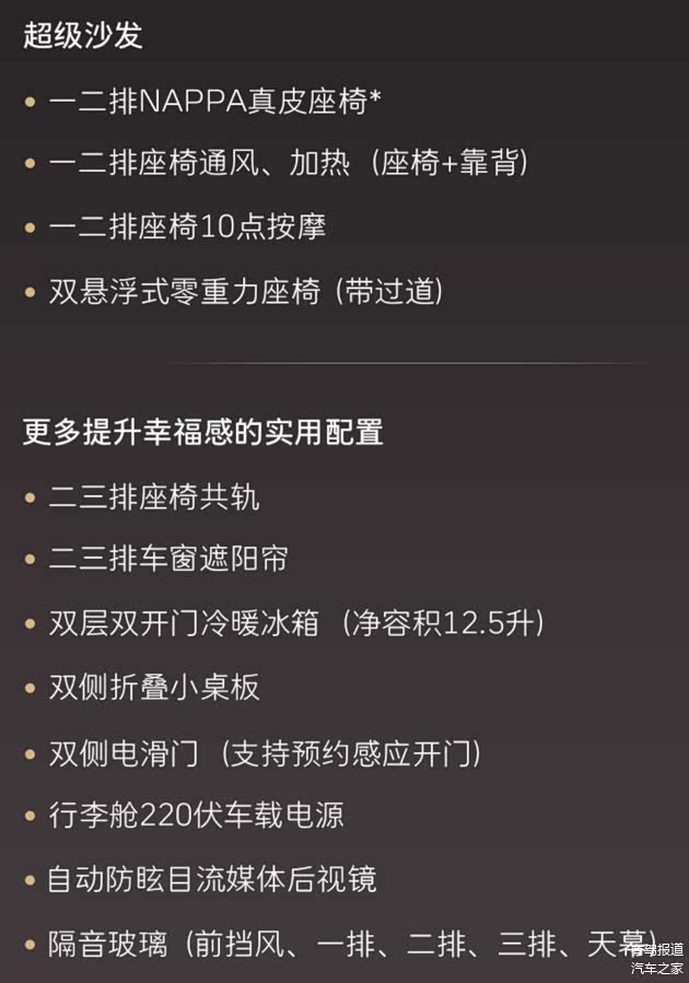 其它配置上,新车配备了前排手机无线充电、流媒体后视镜、冷暖冰箱、23扬声器音响系统以及后排遮阳帘等等。