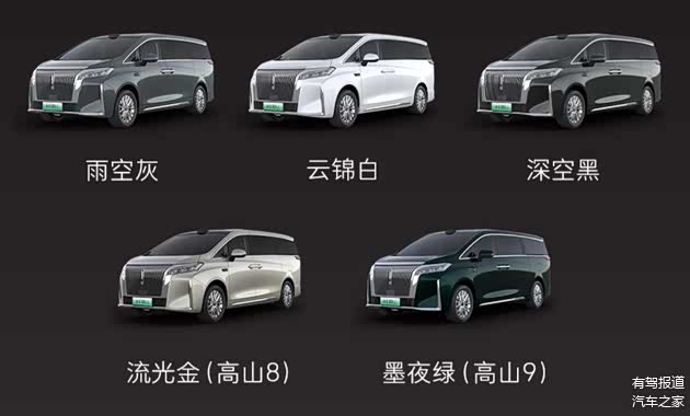 在车身颜色上,三款车型均可选择雨空灰、云锦白、深空黑三种颜色,此外高山7和高山8还额外提供了流光金配色,而高山9则是额外提供了墨夜绿配色。