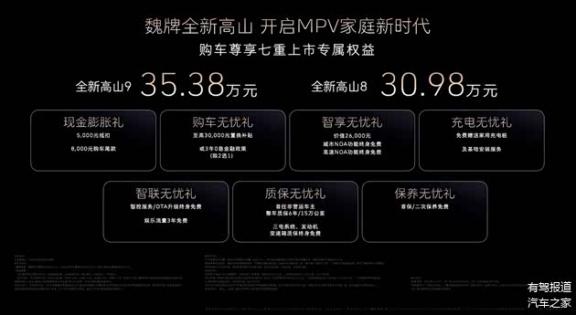 5月13日晚,魏牌高山家族正式上市,其中全新高山8售价为30.98万元、全新高山9售价为35.38万元,高山7将在稍晚与大家见面。在产品定位上,高山8定位宜家宜商,高山9则定位旗舰产品,高山7面向家庭用户。