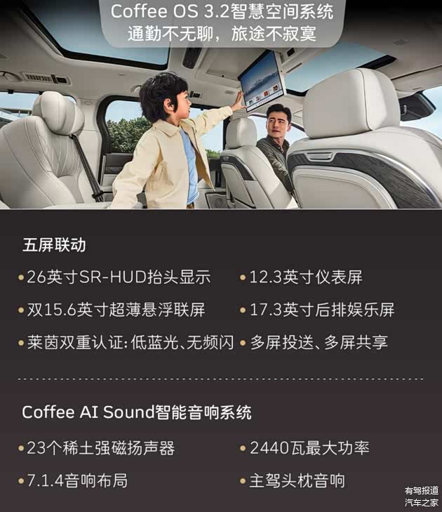 车辆配备了12.3英寸仪表盘、26英寸SR-HUD抬头显示系统,中控屏与副驾屏均为15.6英寸2.5K屏,配备Coffee OS 3系统以及8295芯片,支持Coffee GPT大模型以及HiCar/Carlink手机互联。此外,17.3英寸3K超高清后排娱乐屏可通过语音、手势、触控等方式实现五屏交互。