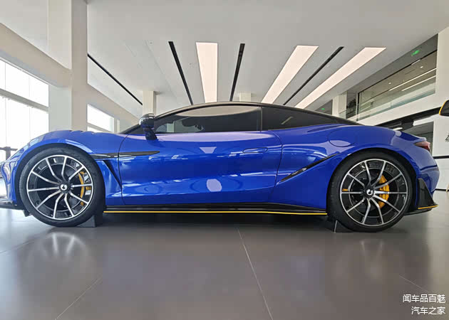 车身侧面部分,在“欧泊蓝”涂装的映衬下,可清晰显露年轻化审美趋势。而前后轮眉的导流孔,搭配内置有黄色大尺寸刹车卡钳的密幅式轮毂,则再次带出了它的超跑车型身份。