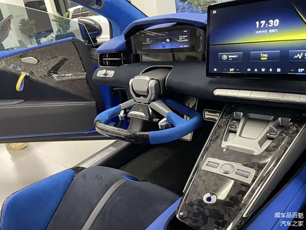 内饰部分,随处可见的碳纤维面板和翻毛皮,结合一体式碳纤维座椅、四点式安全带以及可折叠拆卸、收纳的方向盘,则依然显得十分热血,并能进一步激发使用者的驾驶激情。此外,作为一款新能源车,其全液晶仪表和悬浮式中控屏两块大屏,倒也没让其车内的科技氛围有所下降。