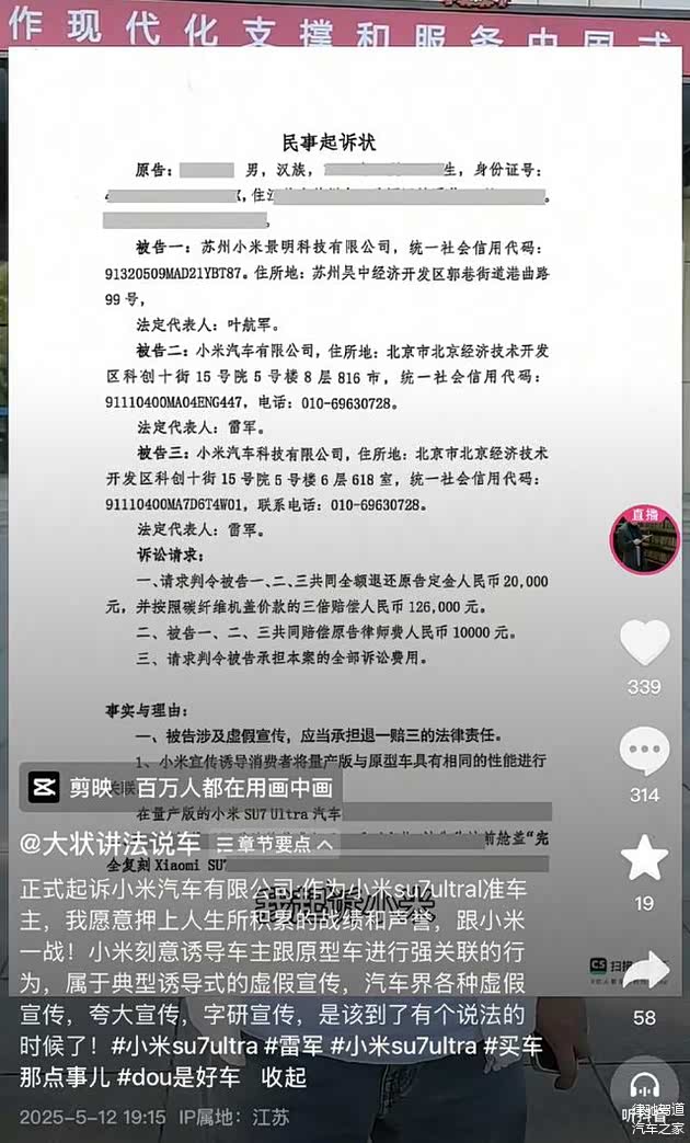 苏州的小米SU7 Ultra准车主陈律师,通过网络平台发布视频称,已经起诉小米汽车及关联公司,并愿意押上人生所积累的战绩和荣誉,跟小米一战。他认为,小米汽车诱导车主跟原型车进行强关联的行为,属于典型诱导式的虚假宣传,要求判令小米汽车及关联公司(被告)退还其20000元,并按照碳纤维机盖价款的三倍赔偿12.6万元;判令被告承担原告律师费1万元;判令被告承担全部诉讼费用。