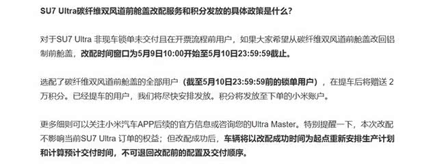 此外,小米汽车决定对未交付的订单提供改配服务,可以改为原本的铝制前舱盖;对于已经提车或是锁单的车主,小米汽车会赠送2万积分(价值2000元)作为关怀补偿。