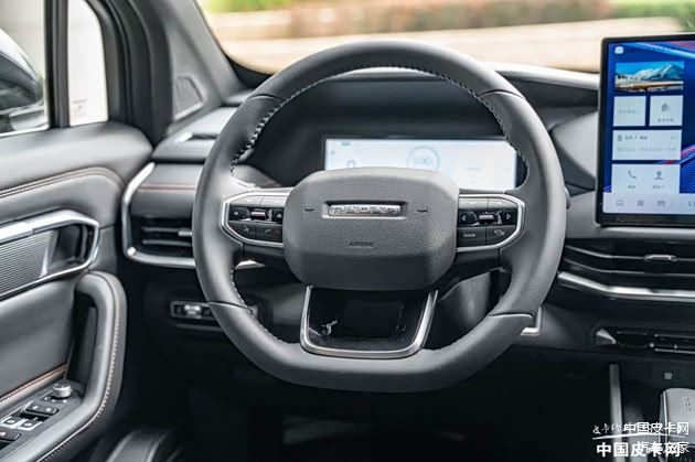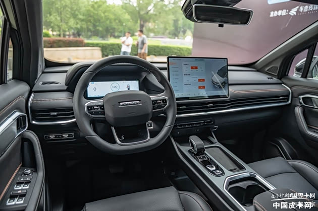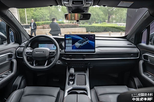 在内饰方面,雷达PHEV展车在整体配置与设计上与地平线顶配保持一致,采用10.2英寸液晶仪表+14.6英寸中控大屏组成人机交互系统。内饰在乘用化与智能化体验在皮卡阵营中属于第一梯队。