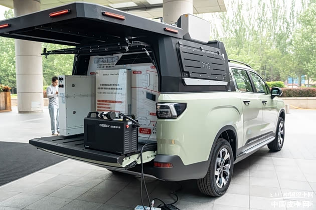 展车在货箱部分展出了以皮卡为中心的能源闭环系统——“雷达万能栈”。这是一个以皮卡为载体,实现 “发 - 储 - 放” 全链路能量闭环的平台化方案,使皮卡不仅是能源的终端使用者,还是能源的分发者,能主动参与能量管理和调度。
